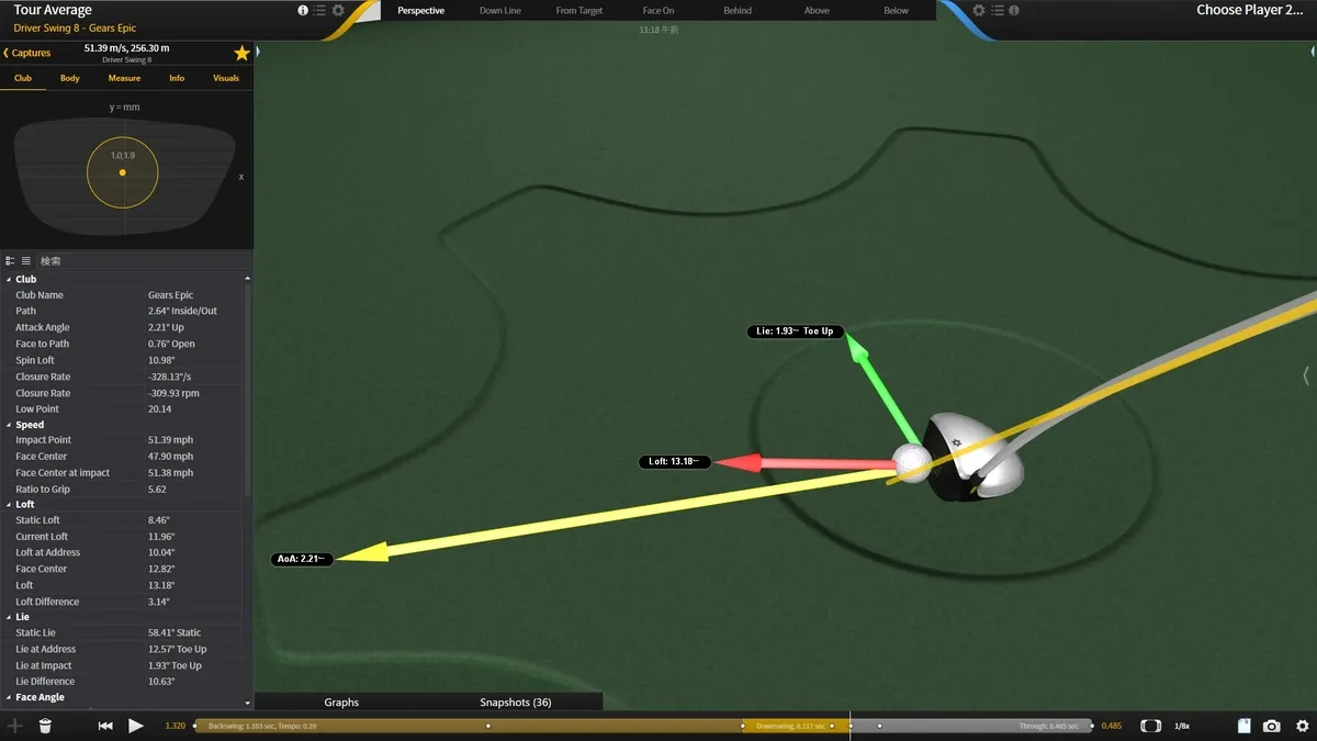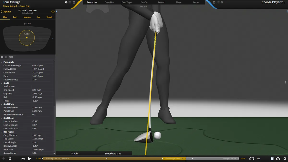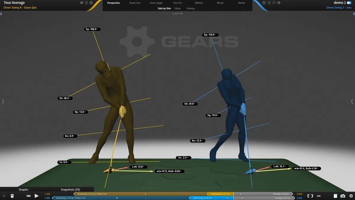 ギアーズは、130万画素、240Hzのカメラ8台を使用した光学式モーションキャプチャ計測システムです。クラブの動きと体の動きが正確に計測され、スイングをデータとして見ることができます。今までのビデオレッスンでは確認することのできなかった、スイング軸の角度や、体の各パーツの回転速度、スイング中のクラブの向きや軌道を知ることができます。